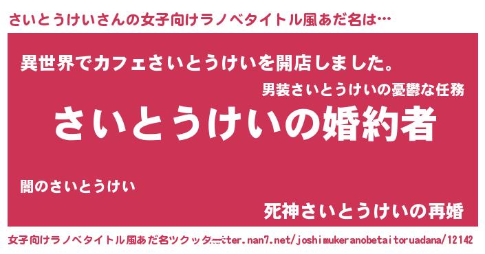 さいとうけいさんの女子向けラノベタイトル風あだ名は… 『さいとうけいの婚約者』『異世界でカフェさいとうけいを開店しました。』『死神さいとうけいの再婚』 ツクッター #女子向けラノベタイトル風あだ名ツクッター http://tkutter.nan7.net/joshimukeranobetaitoruadana/12142/