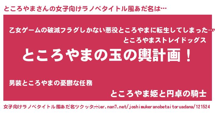 | 男性向けラノベタイトル風あだ名 | 『ところやま~年齢イコール彼女いない歴の魔法使い~』 |