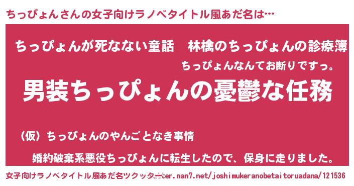 | 胡散臭い通販商品みたいなあだ名 | 『世界中を虜にした100年もののヴィンテージワイン…その名も「ちっぴょん」』 |