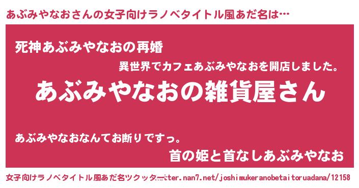 | 男性向けラノベタイトル風あだ名 | 『やはりあぶみやなおの青春ラブコメはまちがっている 』 |