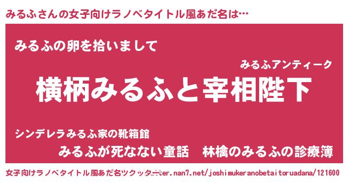 | 男性向けラノベタイトル風あだ名 | 『みるふに滅ぼされるだけの簡単なお仕事です』 |