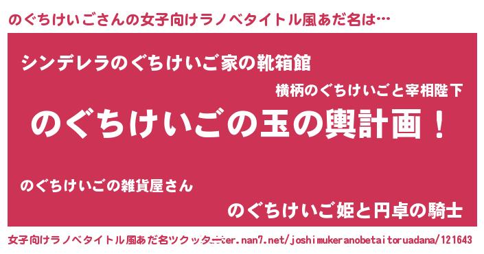 | 男性向けラノベタイトル風あだ名 | 『のぐちけいご~年齢イコール彼女いない歴の魔法使い~』 |