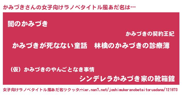 かみづきさんの女子向けラノベタイトル風あだ名は… 『かみづきが死なない童話 林檎のかみづきの診療簿』『闇のかみづき』『シンデレラかみづき家の靴箱館』 ツクッター #女子向けラノベタイトル風あだ名ツクッター http://tkutter.nan7.net/joshimukeranobetaitoruadana/121673/