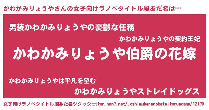 | 男性向けラノベタイトル風あだ名 | 『やはりかわかみりょうやの青春ラブコメはまちがっている 』 |