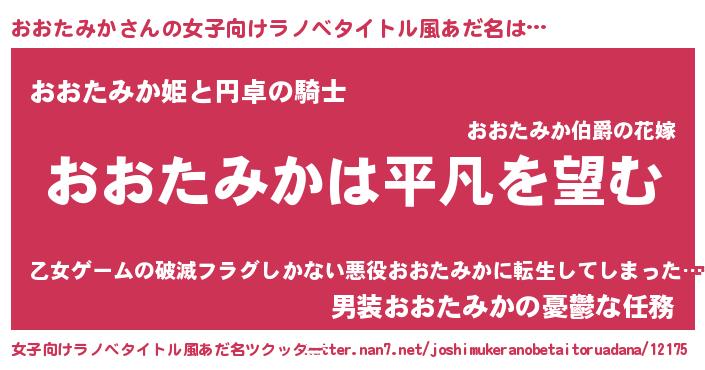 | 胡散臭い通販商品みたいなあだ名 | 『信頼と実績のサプリメント…その名も「おおたみか」』 |