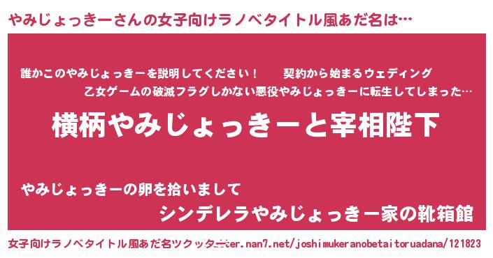 | 男性向けラノベタイトル風あだ名 | 『やみじょっきーに滅ぼされるだけの簡単なお仕事です』 |
