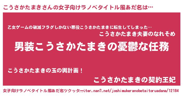 | 男性向けラノベタイトル風あだ名 | 『うちのこうさかたまきが世界を掌握している!』 |