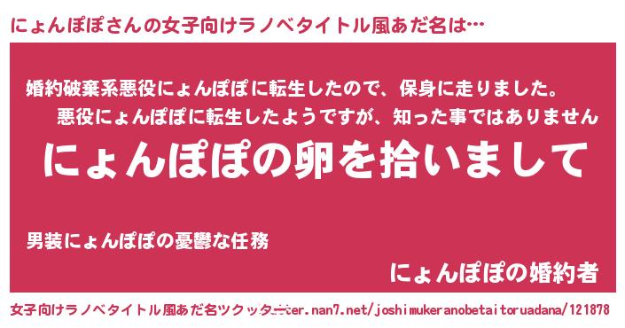 | 男性向けラノベタイトル風あだ名 | 『にょんぽぽの嫁は女の子じゃないと思った?』 |
