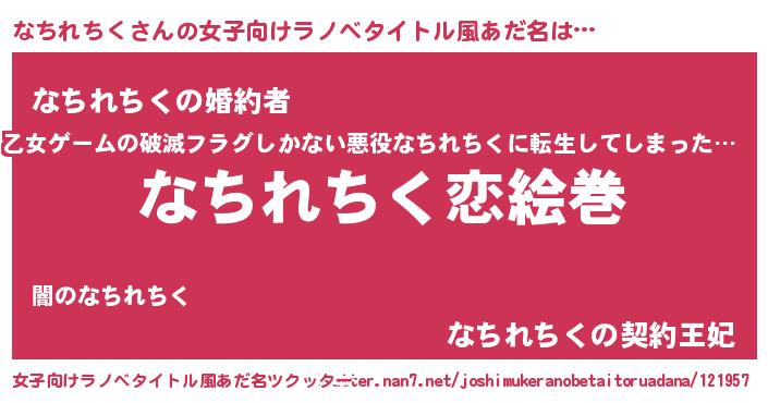| 男性向けラノベタイトル風あだ名 | 『おまえをオタクにしてやるから、俺をなちれちくにしてくれ! 』 |