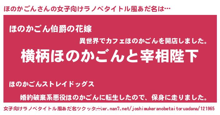 | 男性向けラノベタイトル風あだ名 | 『ほのかごんに滅ぼされるだけの簡単なお仕事です』 |