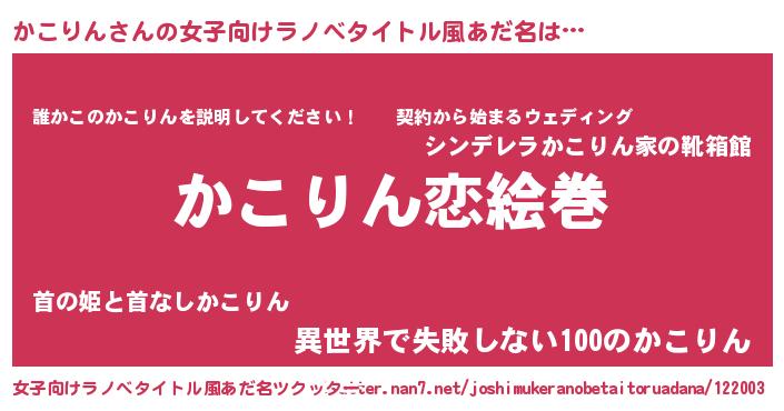| 男性向けラノベタイトル風あだ名 | 『おまえをオタクにしてやるから、俺をかこりんにしてくれ! 』 |