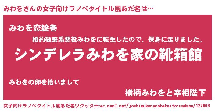 | 男性向けラノベタイトル風あだ名 | 『冴えないみわをの育てかた』 |