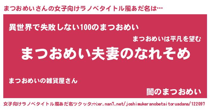 | 男性向けラノベタイトル風あだ名 | 『おまえをオタクにしてやるから、俺をまつおめいにしてくれ! 』 |