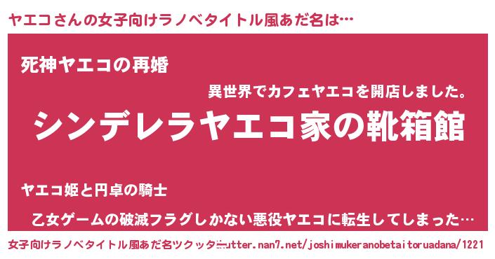 | 男性向けラノベタイトル風あだ名 | 『緋弾のヤエコ』『魔弾の王とヤエコ』 |