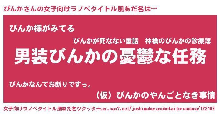 | 男性向けラノベタイトル風あだ名 | 『うちのびんかが世界を掌握している!』 |