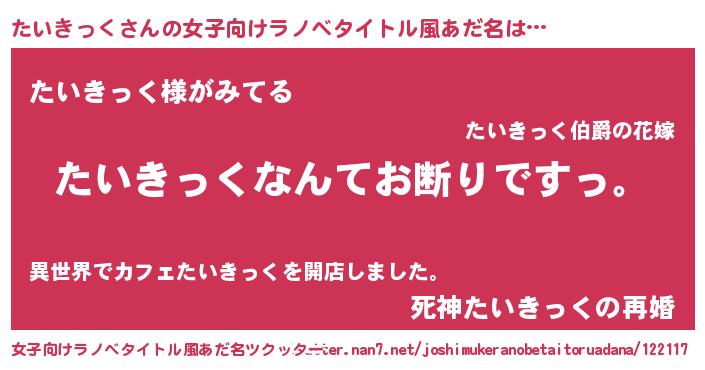 | 男性向けラノベタイトル風あだ名 | 『魔法科高校のたいきっく』 |