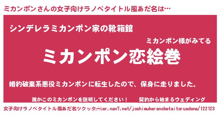 | 男性向けラノベタイトル風あだ名 | 『おまえをオタクにしてやるから、俺をミカンポンにしてくれ! 』 |