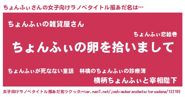 | 男性向けラノベタイトル風あだ名 | 『ちょんふぃの嫁は女の子じゃないと思った?』 |