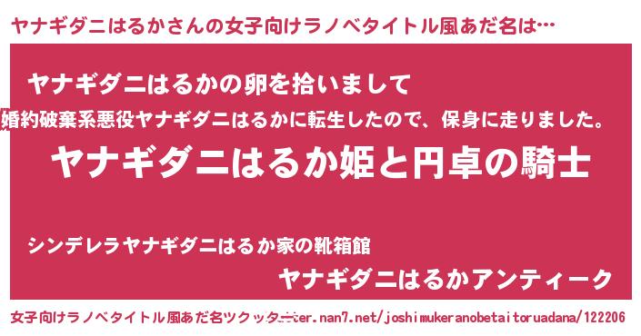| 男性向けラノベタイトル風あだ名 | 『ヤナギダニハルカアートオンライン』 |