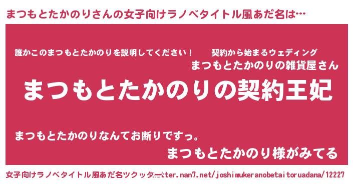 | 男性向けラノベタイトル風あだ名 | 『まつもとたかのりという概念が存在しない退屈な世界 』 |