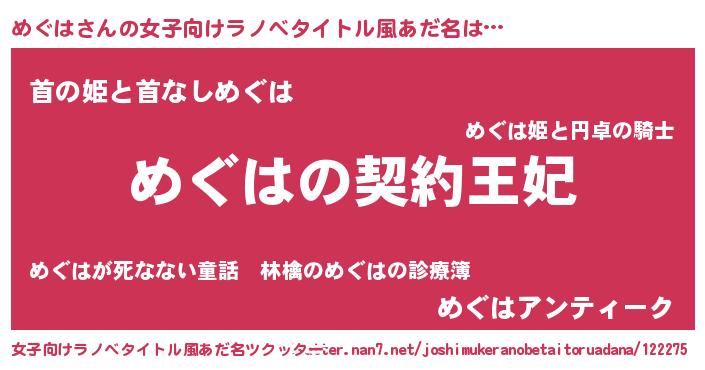| 男性向けラノベタイトル風あだ名 | 『めぐはという概念が存在しない退屈な世界 』 |