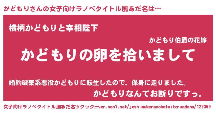 | 男性向けラノベタイトル風あだ名 | 『かどもりの嫁は女の子じゃないと思った?』 |