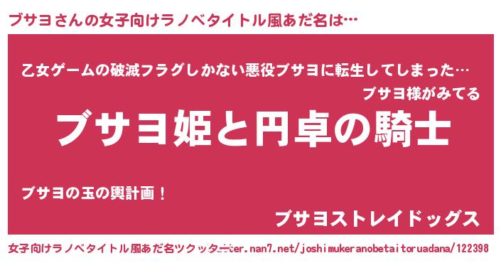 | 男性向けラノベタイトル風あだ名 | 『ブサヨの憂鬱』『魔弾の王とブサヨ』 |