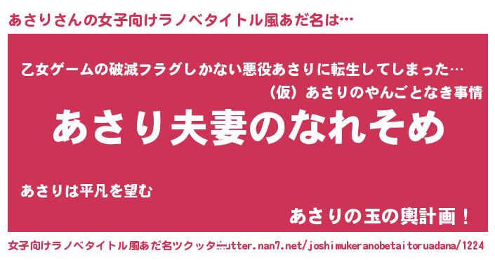 | 男性向けラノベタイトル風あだ名 | 『おまえをオタクにしてやるから、俺をあさりにしてくれ! 』 |