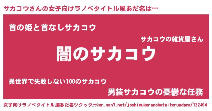 サカコウさんの女子向けラノベタイトル風あだ名は… 『闇のサカコウ』『首の姫と首なしサカコウ』『男装サカコウの憂鬱な任務』 ツクッター #女子向けラノベタイトル風あだ名ツクッター http://tkutter.nan7.net/joshimukeranobetaitoruadana/122404/
