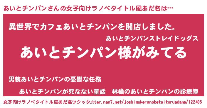 | 男性向けラノベタイトル風あだ名 | 『あいとチンパンの嫁は女の子じゃないと思った?』 |