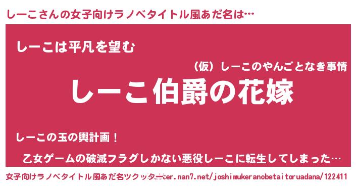 | 男性向けラノベタイトル風あだ名 | 『うちの娘の為ならば、俺はもしかしたらしーこも倒せるかもしれない。』 |