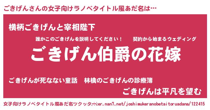 | 男性向けラノベタイトル風あだ名 | 『うちの娘の為ならば、俺はもしかしたらごきげんも倒せるかもしれない。』 |