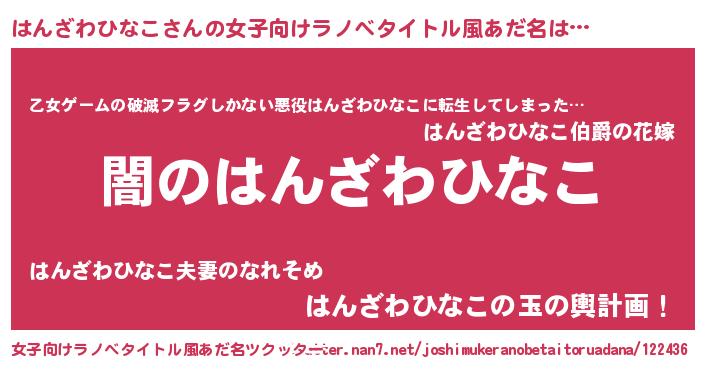 | 男性向けラノベタイトル風あだ名 | 『Re:はんざわひなこから始める異世界生活』 |