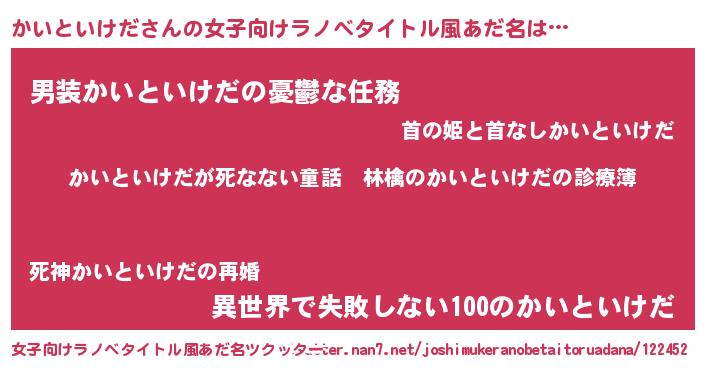 | 男性向けラノベタイトル風あだ名 | 『魔弾の王とかいといけだ』 |