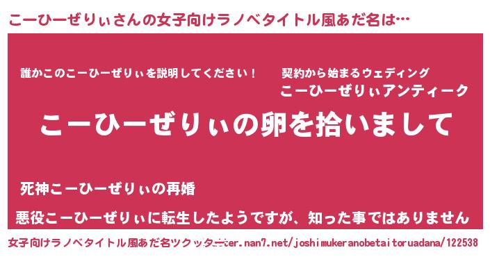 | 男性向けラノベタイトル風あだ名 | 『こーひーぜりぃの嫁は女の子じゃないと思った?』 |