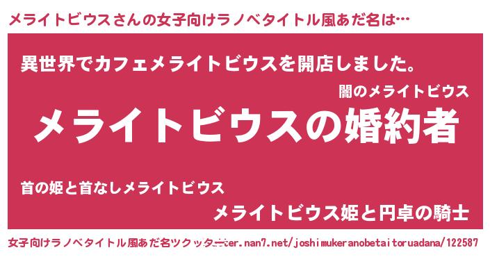 メライトビウスさんの女子向けラノベタイトル風あだ名は… 『メライトビウスの婚約者』『異世界でカフェメライトビウスを開店しました。』『メライトビウス姫と円卓の騎士』 ツクッター #女子向けラノベタイトル風あだ名ツクッター http://tkutter.nan7.net/joshimukeranobetaitoruadana/122587/