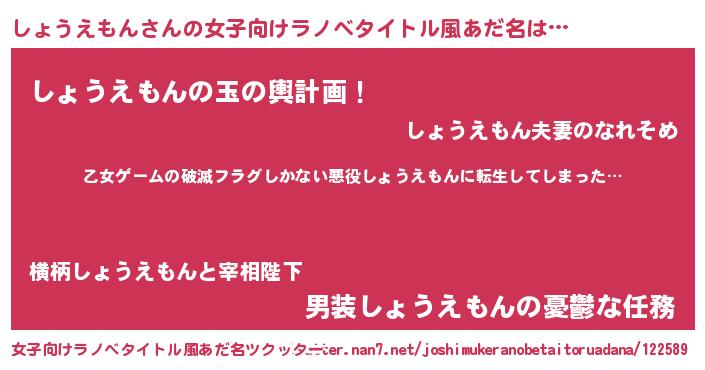 | 男性向けラノベタイトル風あだ名 | 『魔弾の王としょうえもん』 |