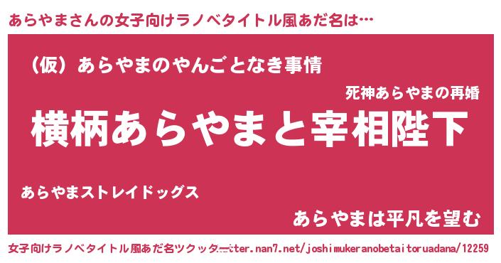 | 男性向けラノベタイトル風あだ名 | 『あらやまに滅ぼされるだけの簡単なお仕事です』 |