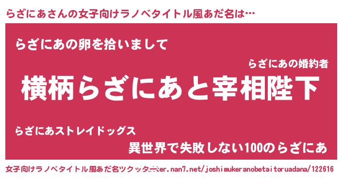 | 男性向けラノベタイトル風あだ名 | 『らざにあに滅ぼされるだけの簡単なお仕事です』 |
