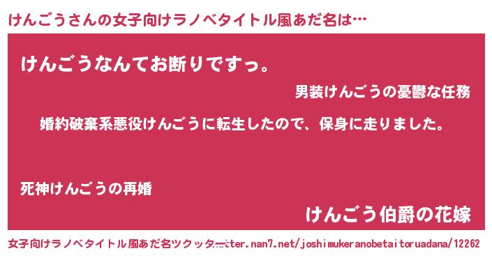 | 男性向けラノベタイトル風あだ名 | 『転生したらけんごうだった件』 |
