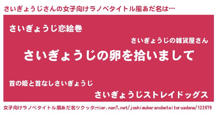 | 男性向けラノベタイトル風あだ名 | 『さいぎょうじの嫁は女の子じゃないと思った?』 |
