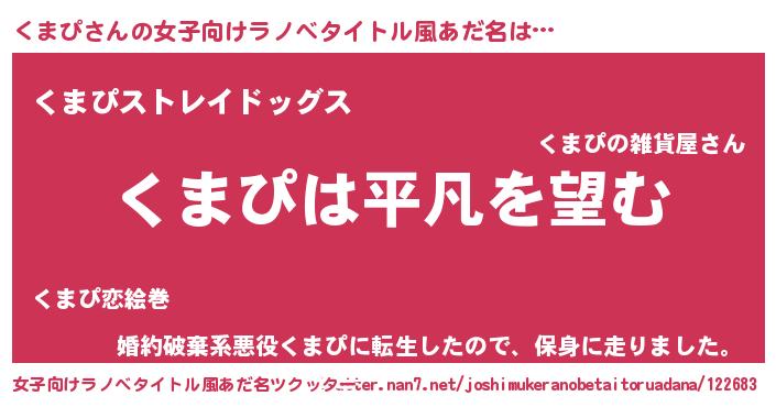 | 男性向けラノベタイトル風あだ名 | 『ダンジョンにくまぴを求めるのは間違っているだろうか』 |