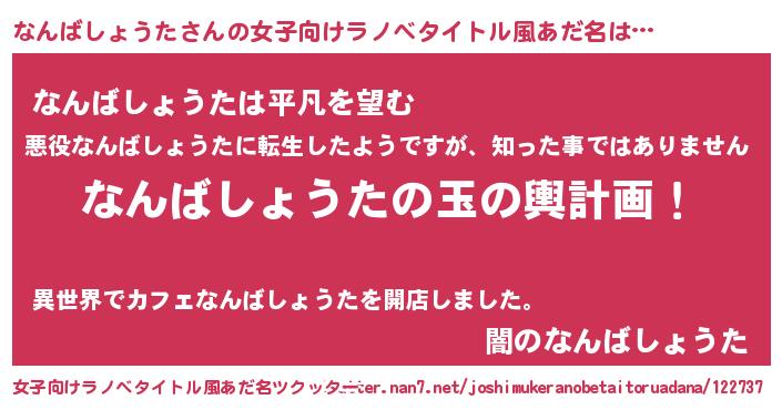 | 男性向けラノベタイトル風あだ名 | 『なんばしょうた~年齢イコール彼女いない歴の魔法使い~』 |