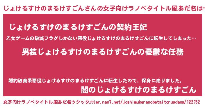 | 男性向けラノベタイトル風あだ名 | 『うちのじょけるすけのまるけすごんが世界を掌握している!』 |