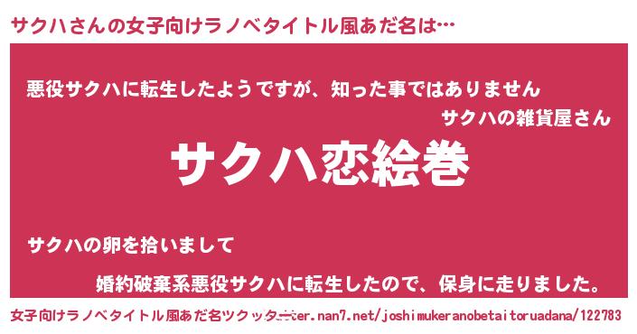 | 男性向けラノベタイトル風あだ名 | 『おまえをオタクにしてやるから、俺をサクハにしてくれ! 』 |