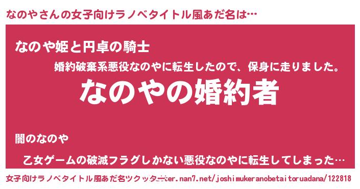 なのやさんの女子向けラノベタイトル風あだ名は… 『なのやの婚約者』『なのや姫と円卓の騎士』『乙女ゲームの破滅フラグしかない悪役なのやに転生してしまった…』 ツクッター #女子向けラノベタイトル風あだ名ツクッター http://tkutter.nan7.net/joshimukeranobetaitoruadana/122818/