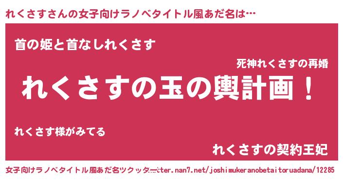 | 男性向けラノベタイトル風あだ名 | 『れくさす~年齢イコール彼女いない歴の魔法使い~』 |