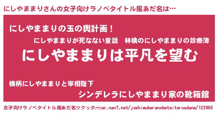 | 男性向けラノベタイトル風あだ名 | 『ダンジョンににしやままりを求めるのは間違っているだろうか』 |