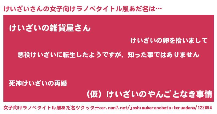 | 男性向けラノベタイトル風あだ名 | 『この素晴らしい世界にけいざいを!』 |