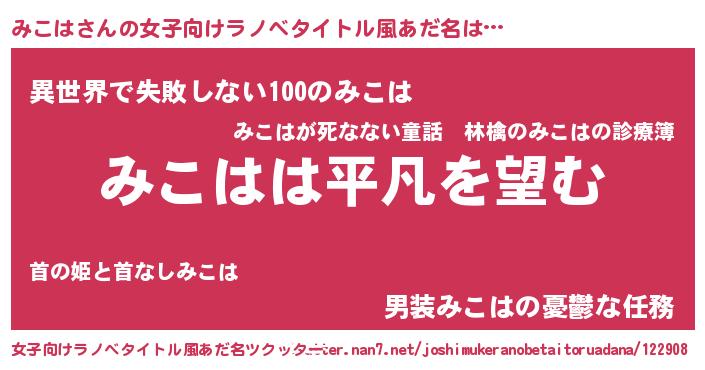 | 男性向けラノベタイトル風あだ名 | 『ダンジョンにみこはを求めるのは間違っているだろうか』 |